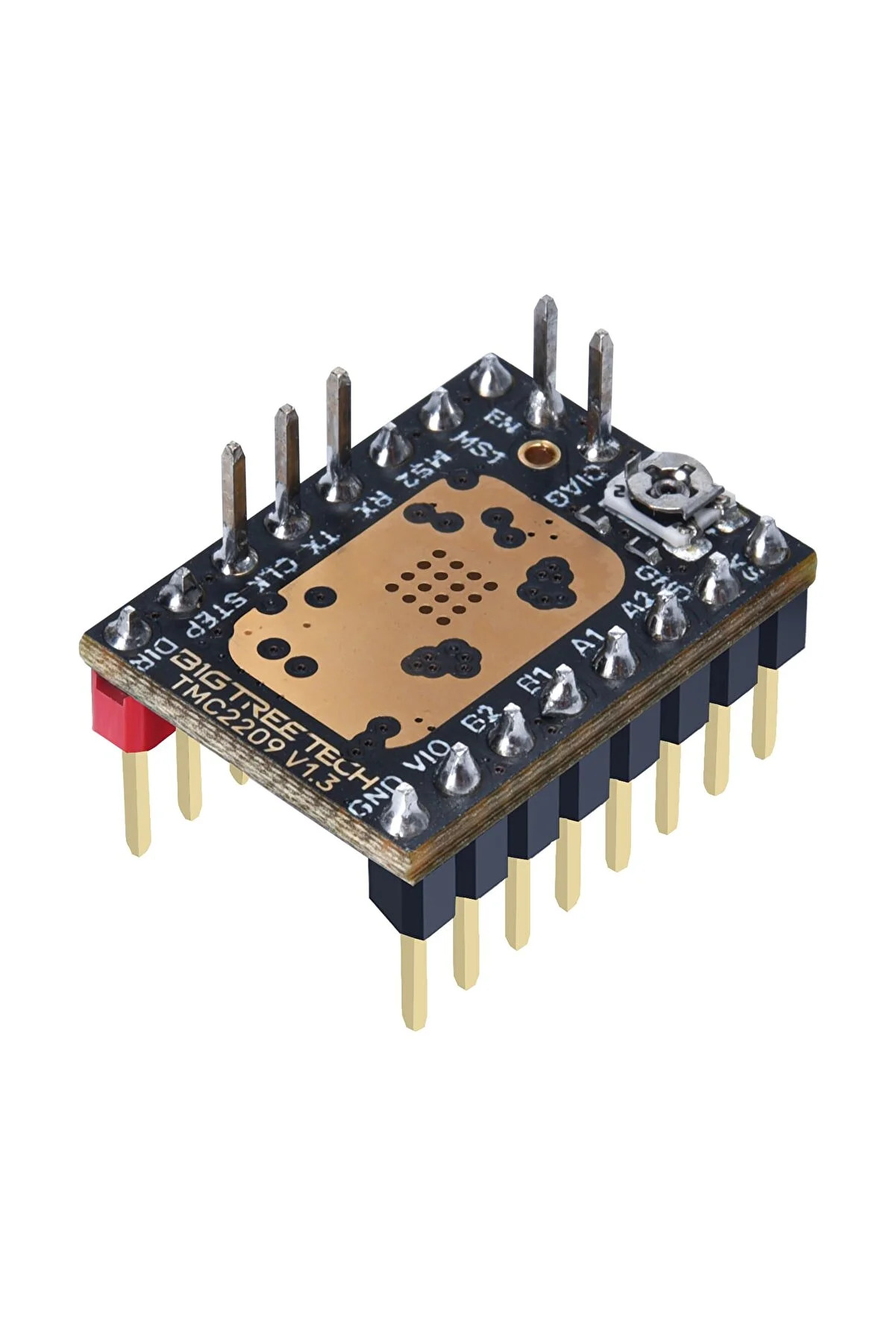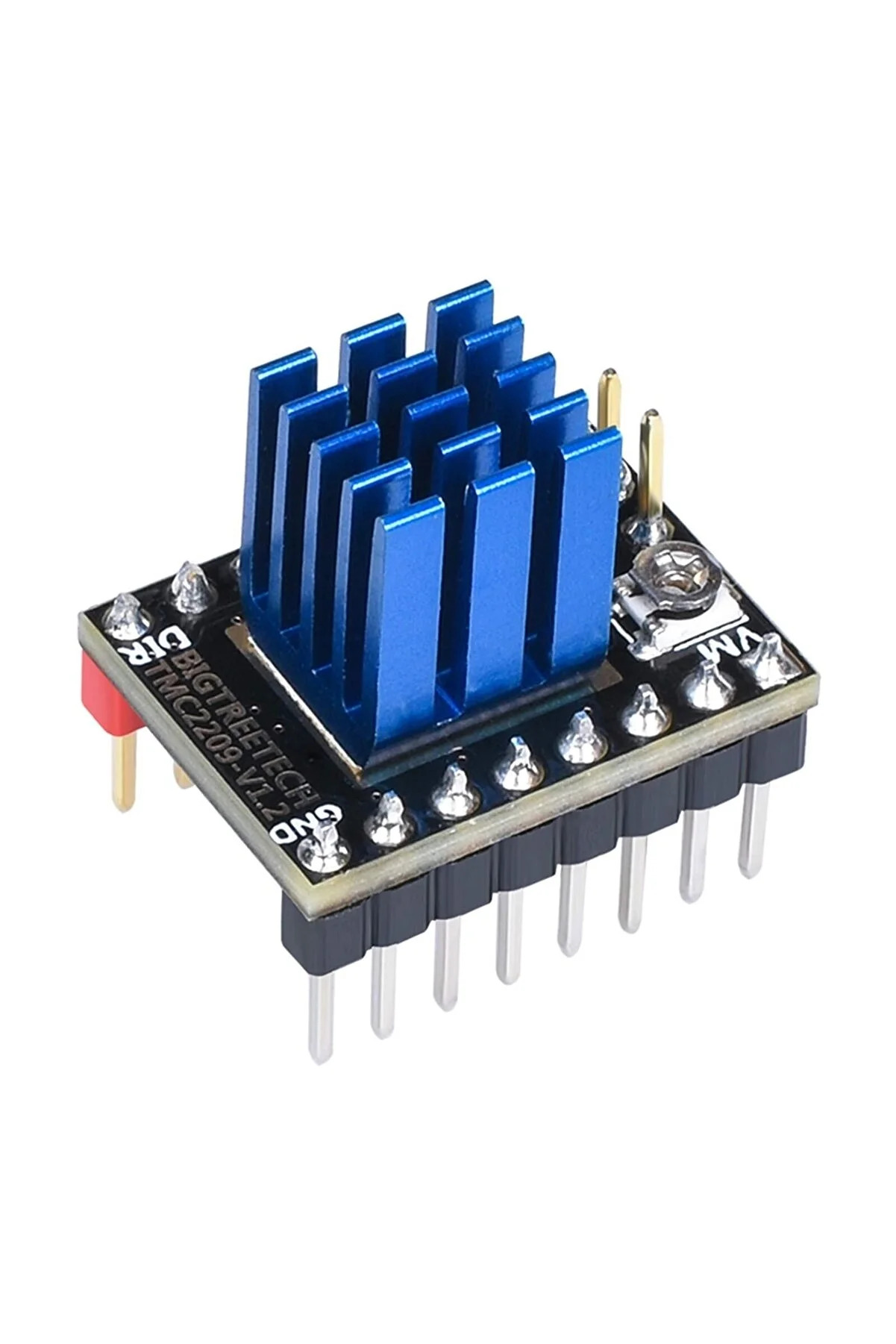 TMC2209, çift faz step motorlar için üretilmiş ultra sessiz bir motor sürücüdür. A4988, DRV8825, TMC2208 gibi sürücülerle birebir değişiklik yapılabilen tamamen uyumlu pin dizilimine sahiptir. Alman Trinamic firmasının geliştirdiği TMC akıllı chipsetleri, ultra sessiz oluşu, daha yüksek akımları desteklemesi, daha iyi ısı dağıtımı gibi avantajlar sağlamaktadır. Tmc 2209 sürücüsü hızlı akım regülasyonu özelliği ile yüksek hız veya tork gerekmeyen durumlarda sürücü akımını düşürerek ultra sessiz modda çalışmaktadır (StealthChop2). Hız ve Tork gereksinimi arttığı zaman sürücü otomatik olarak akımı arttırarak Spreadcycle moduna geçer böylece maksimum verimlilik sağlanmaktadır. TMC 2209 sahip olduğu stallguard 4 özelliği ile step motorlar üzerindeki tork değişikliklerini elektriksel olarak algılamaktadır. Bu özellik bize herhangi bir limit switch kullanmadan otomatik merkezleme yapma imkanı sağlamaktadır. Yüksek kaliteli mosfetler ile 2.8 a (Maks Rms) motor akımını desteklemektedir. Kullanımı kolay UART arayüzü, ultra sessiz oluşu, yüksek akım işleme kabiliyeti ve stallguard özelliğini birarada sunması ile TMC chipsetli kartların en uygun fiyat performans oranına sahiptir. Twotrees TMC 2209 ile Makerbase TMC 2209 tamamen aynı kalite ve özelliklerde olup aynı fabrikada üretilmektedir.